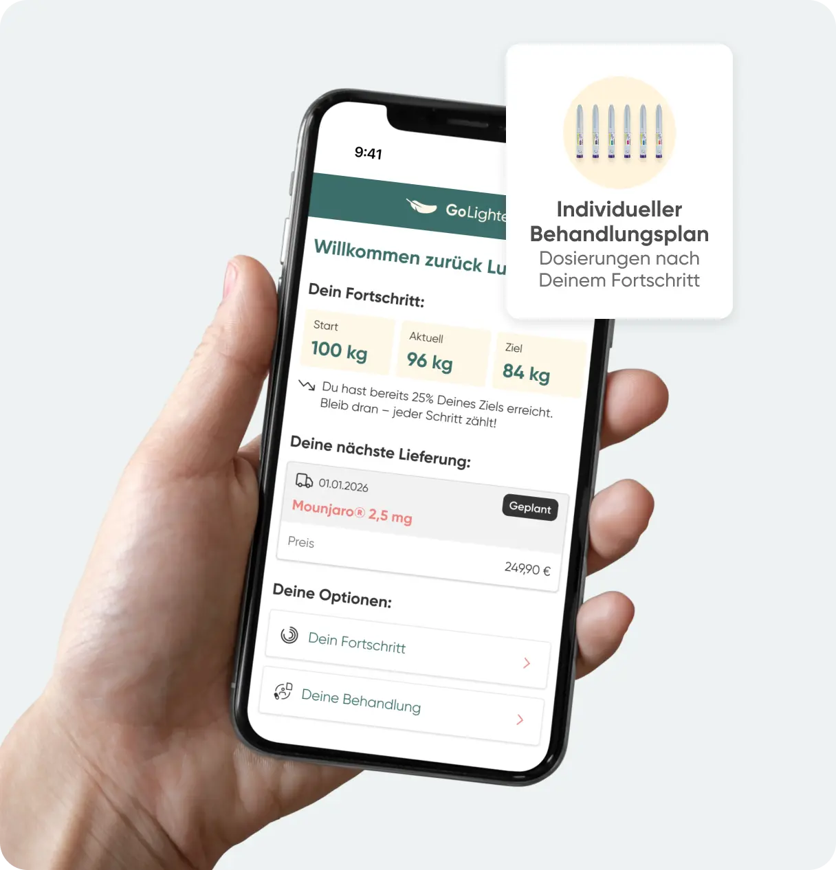 Wenn Du für eine Behandlung mit Mounjaro® geeignet bist, erhältst Du Dein Rezept online oder offline. Das Medikament wird Dir innerhalb von 2–3 Tagen diskret geliefert, während Dich ein Ärzteteam durch die Therapie begleitet und Deine Dosierung individuell anpasst.